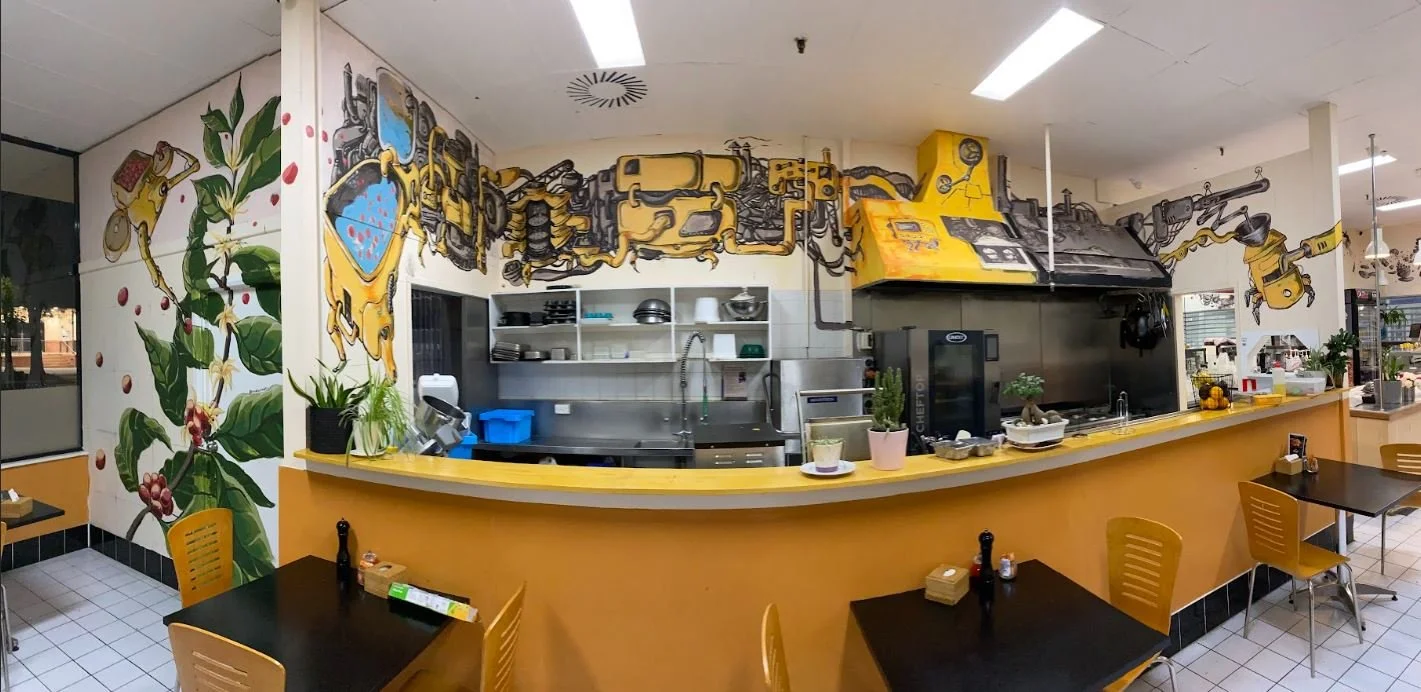 The mural tells a story about the coffee production process, from raw materials to the final product, in an exaggerated manner. With its intricate brewing machine combining technical prowess and artistic flair, the mural is not just a piece of art but also an endless source of inspiration.